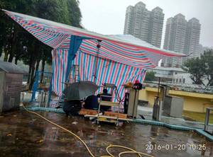 吉大一二期消毒灯管的更换工作是年前最后一项较大的工作任务,一月下旬,按照部门计划安排和灯管的供货进度,吉大一二期消毒灯管更换工作于20日由一期开始正式铺开。正巧,也是五十年一遇的“超级寒流”来袭之时,急剧的低温夹带着风雨,天气十分的恶劣。根据天气预报,虽然机修班早有准备搭起了挡雨棚,但露天室外作业寒风阵阵吹来,慢慢令手脚僵硬不麻利,给更换灯管工作带来极大的不便及困扰。更大的问题是,由于低温雨天的原因,周围湿度较大的空气从套管开口进入后在玻璃套管壁上产生水汽形成水珠,给日后的正常使用留下安全隐患。