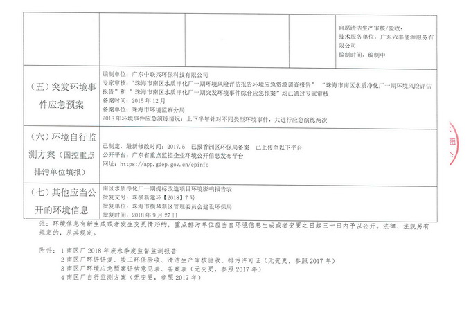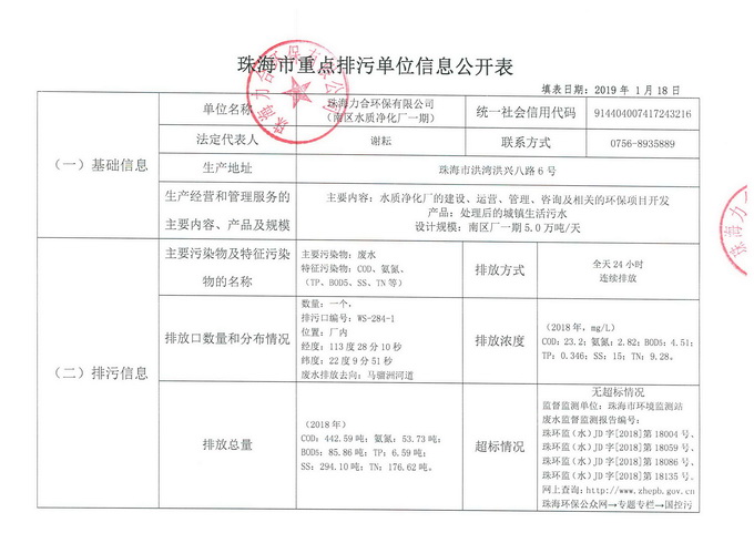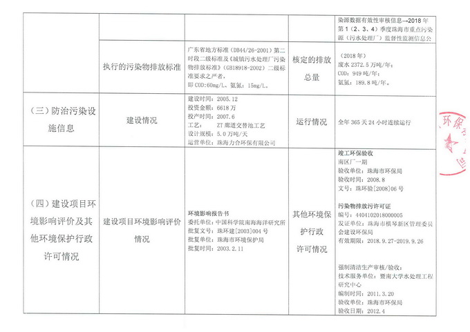 2018年珠海市重点排污单位信息公开表(南区水质净化厂一期)